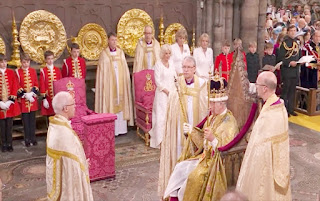 - कैंटरबरी के आर्कबिशप ने वेस्टमिंस्टर एब्बे में एक समारोह के दौरान राजा के सिर पर सेंट एडवर्ड का मुकुट रखा और राजा के राज्याभिषेक के बाद, उनकी पत्नी कैमिला को रानी के रूप में ताज पहनाया गया।